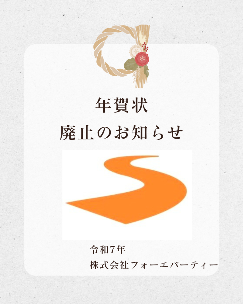 時下ますますご清栄のこととお慶び申し上げます。平素は格別のご高配を賜り厚く御礼申し上げます。この度弊社では、近年の虚礼廃止の流れや地球環境問題の深刻化を背景に、環境対策の取り組みを強化して参りました。また省資源化による環境負荷低減とデジタル環境への移行推進の観点から、2025年度以降も年賀状による年始のご挨拶を取り止めることといたしました。